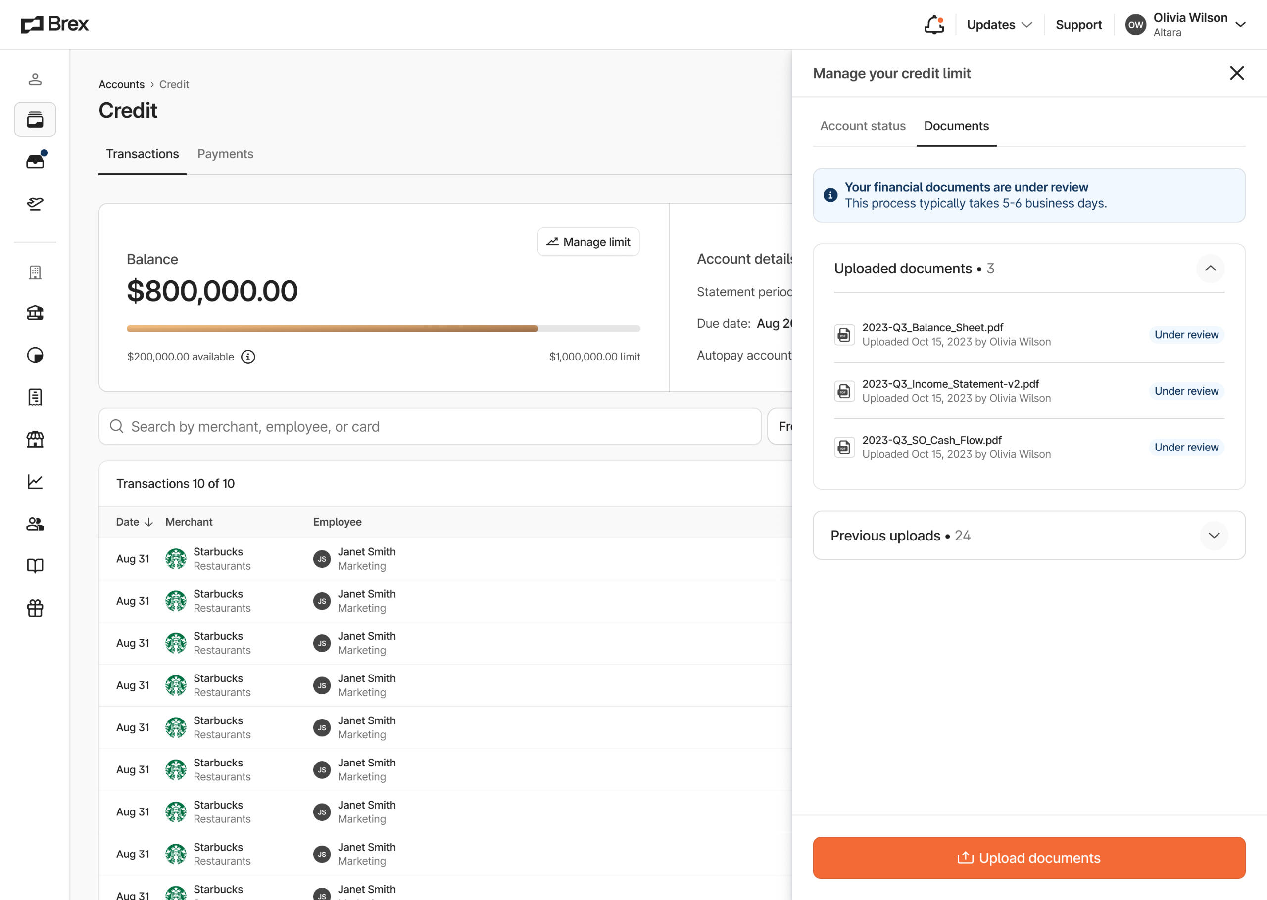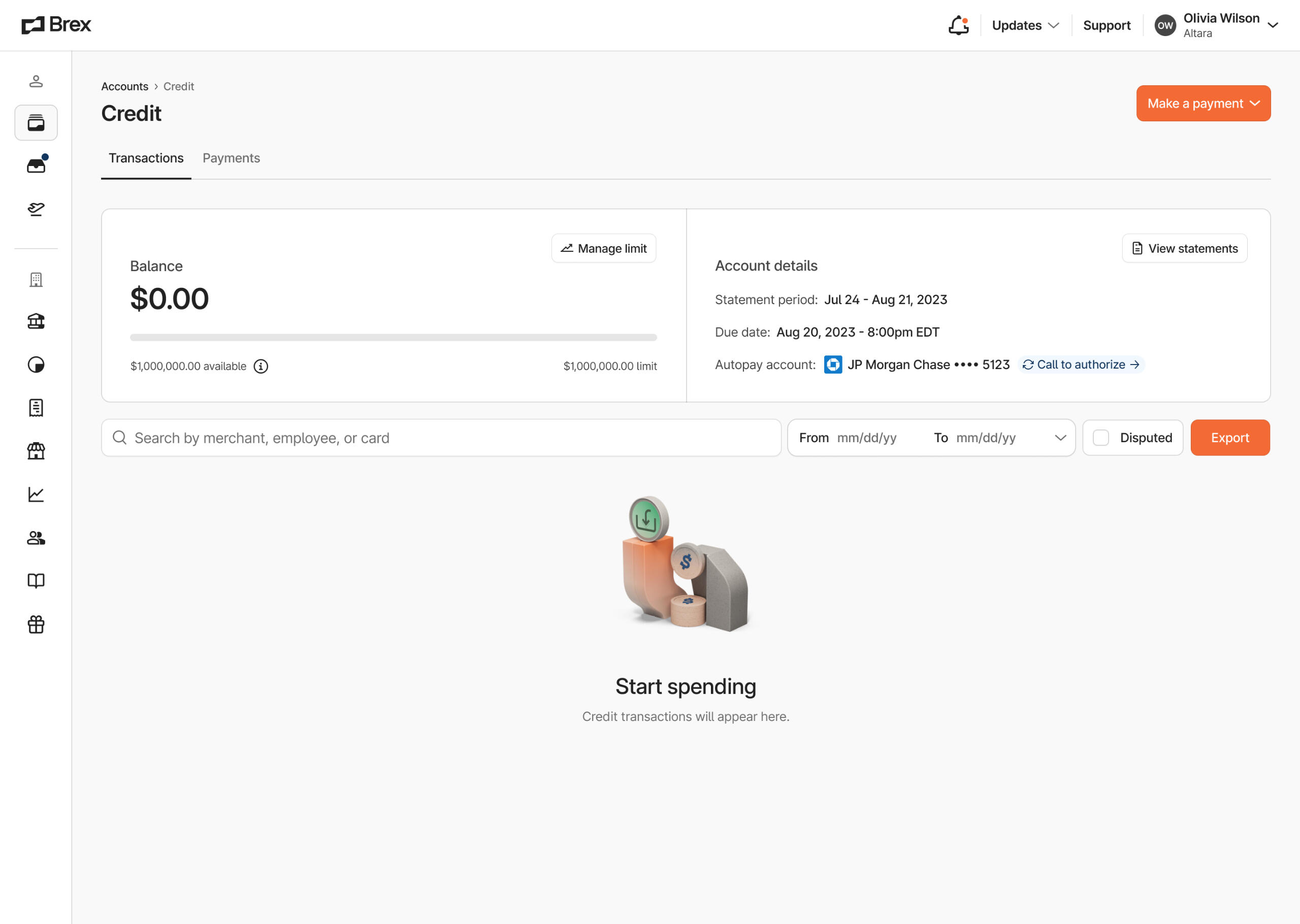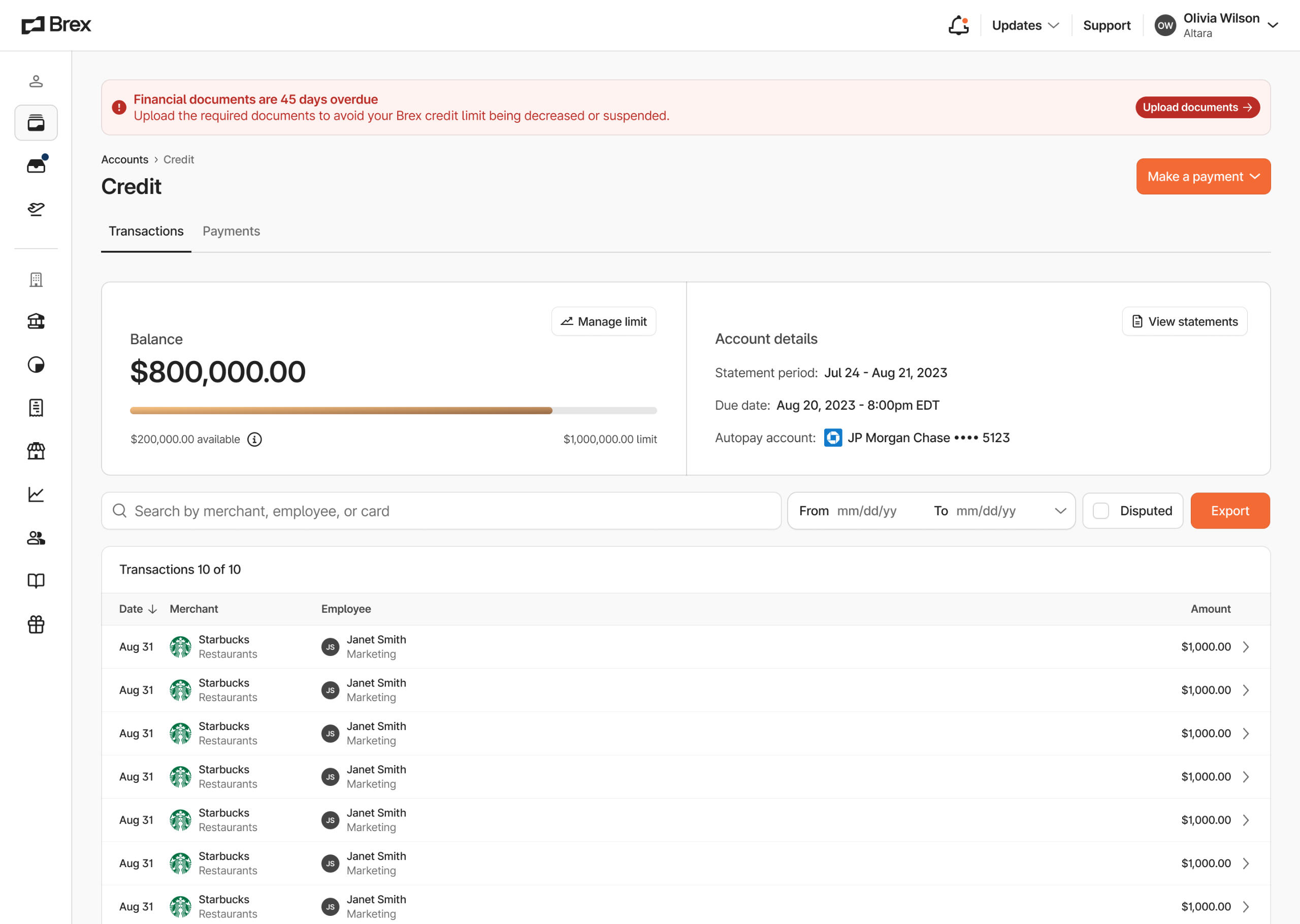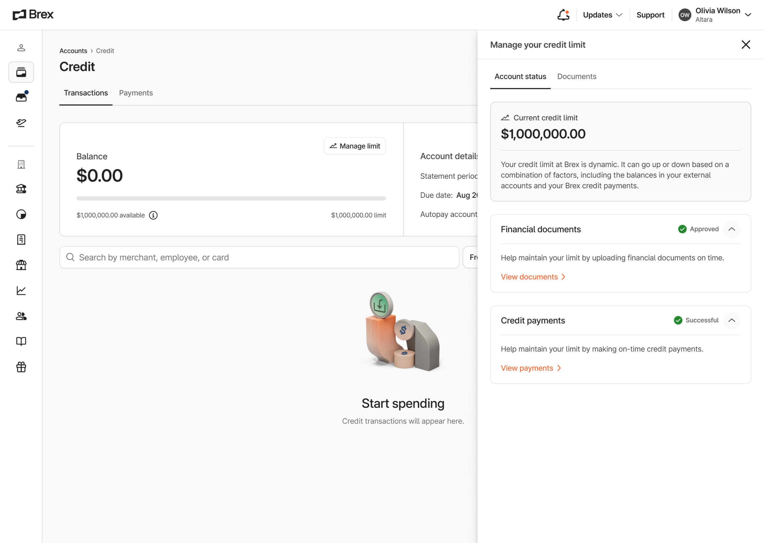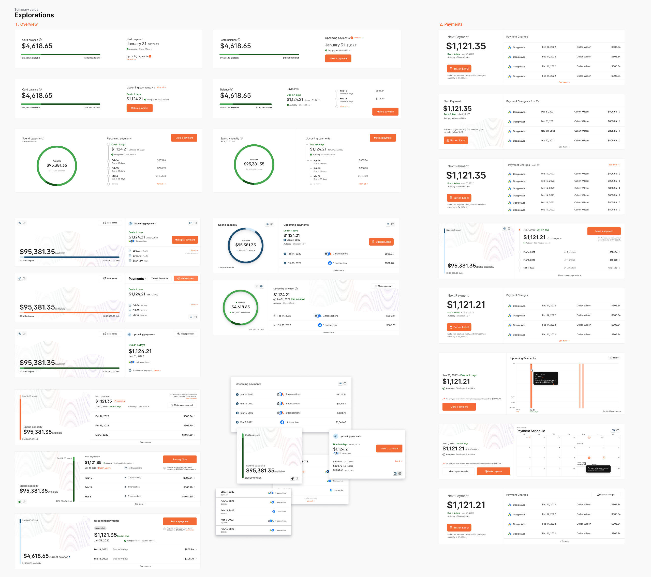 One particular challenge included clearly depicting the summary of upcoming payments — at its most complicated, a Brex admin could see as many as 30 upcoming daily payments. As such, I paid particular focus to the Overview and Payments summary cards, as they presented opportunities to visualize critical information for managing this novel card experience at-a-glance.Because this particular demographic was concerned with making the most of their credit limit, I recommended we invert the card balance visualization from depicting Balance to leading with Available spend instead.