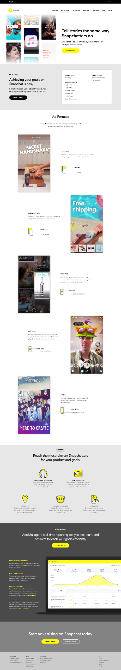 After the team found success with our original redesign, they updated the product set they offered to advertisers. They reached back out and we helped them with a content update for the Snap for Business site, adding a product explanation page and a partner showcase.