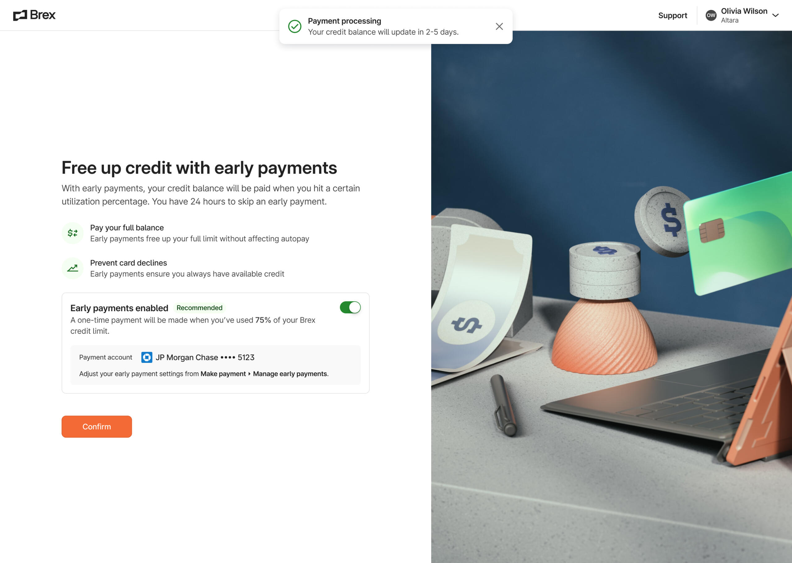 In our upsell modal, we clearly laid out the value proposition of the early payments feature. I proposed we should lead with as much preconfiguration as possible, which included selecting the same bank account that was just used for the one-time payment. Rather than allowing in-line configuration of the utilization trigger, I had the product engineer find the most common value set for those successfully running the feature.