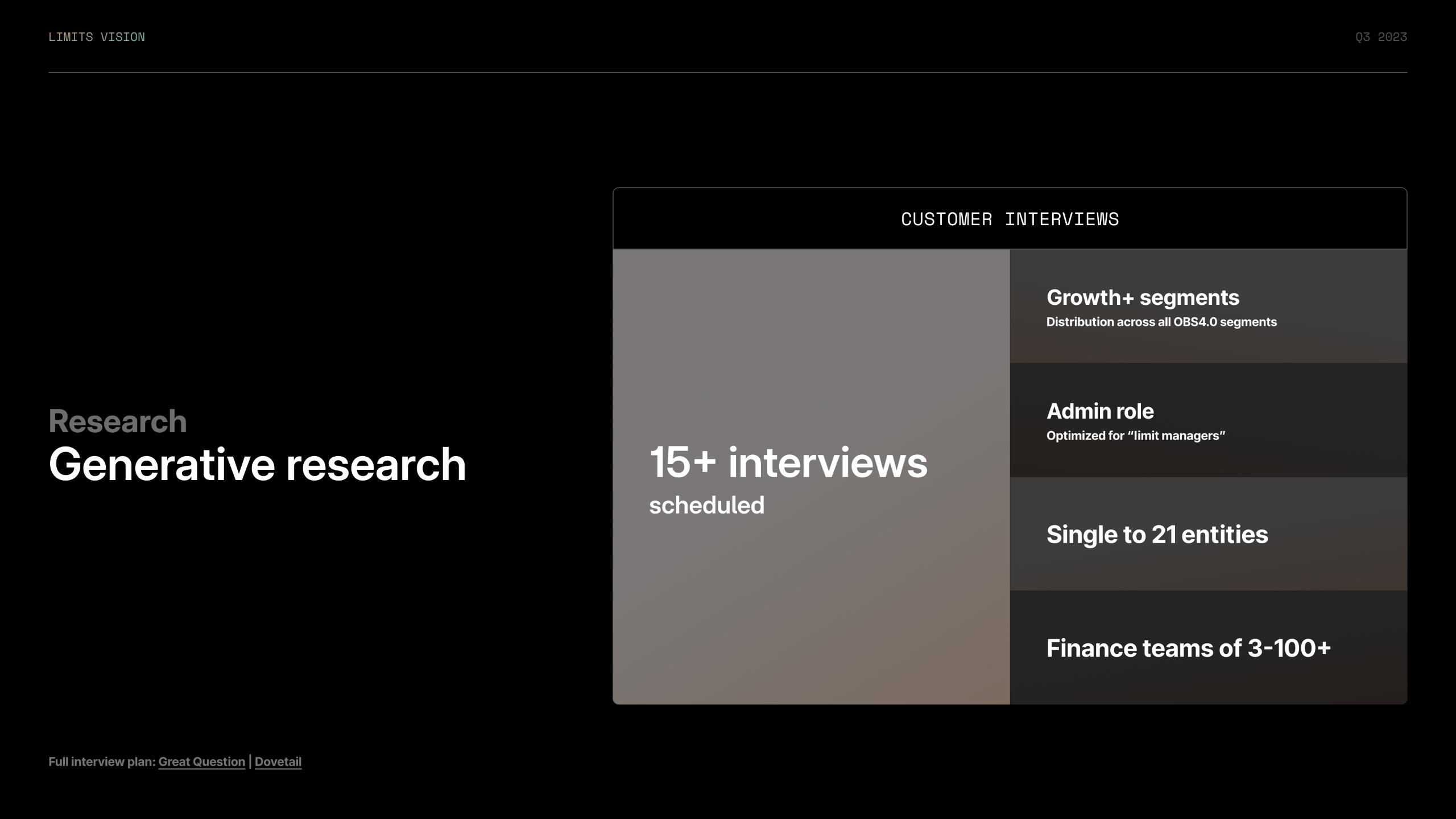 Lacking a dedicated research function, I wrote, sought feedback on, and finalized a research plan and interview script. I also coordinated and held over 15 customer interviews to gather qualitative research. I focused the conversations around underwriting requirements, credit limit education, and the onboarding and ongoing limit management processes of mid-market and enterprise "limit managers" — a profile I created for the purposes of the study.