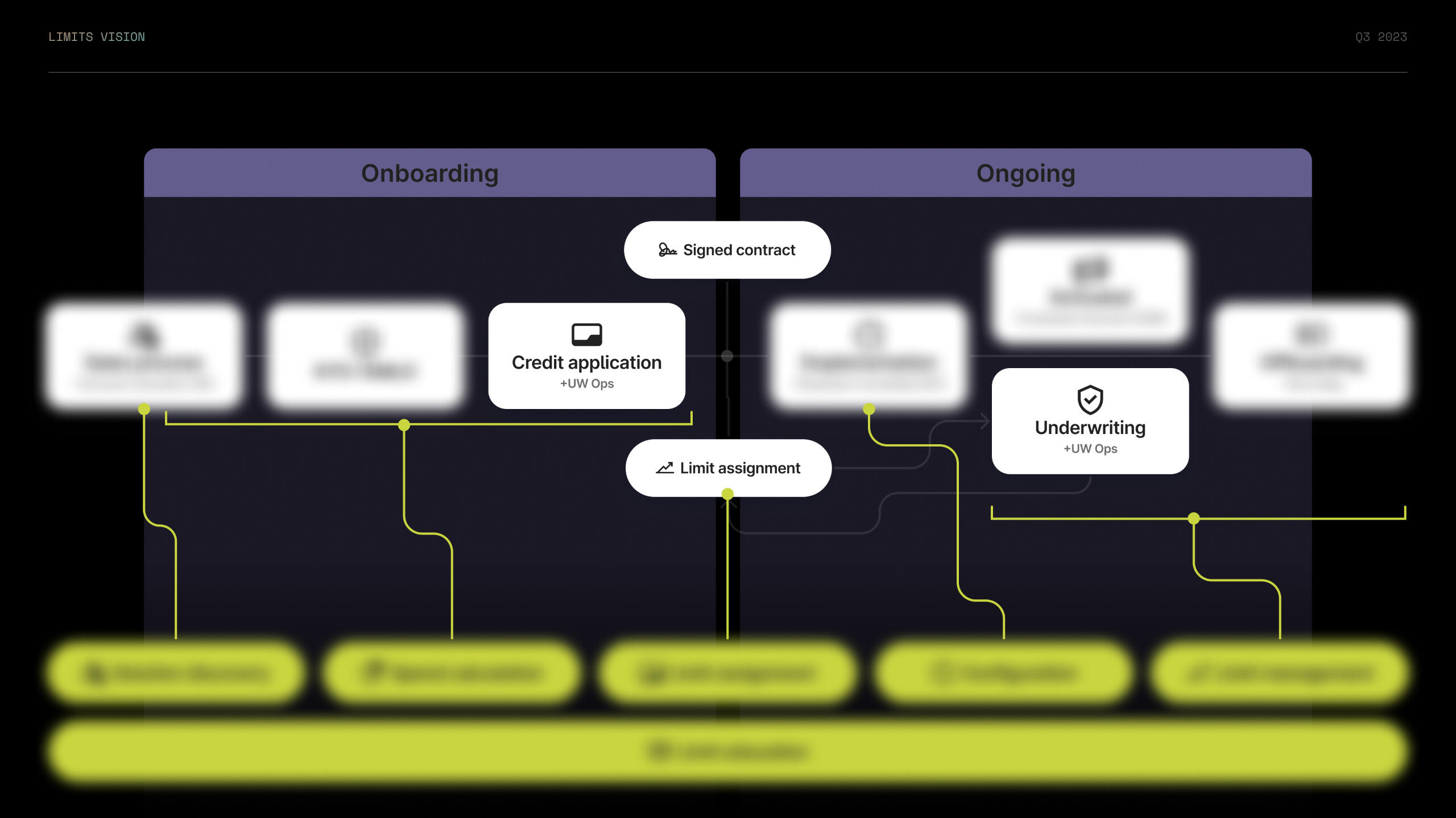 In Q2 2023, our team collaborated with other xfn product teams to support the new company strategy by automating the credit and underwriting requirements for larger customers. The temporary manual processes we had in place were cumbersome for Sales, UW Ops, and Support, hindering our ability to scale quickly.For this significant product update, we collectively decided to sequence updating the Onboarding [M1] phase (credit application and product onboarding) phase with an updated application variant before moving on to the Ongoing [M2] phase (post-approval).
