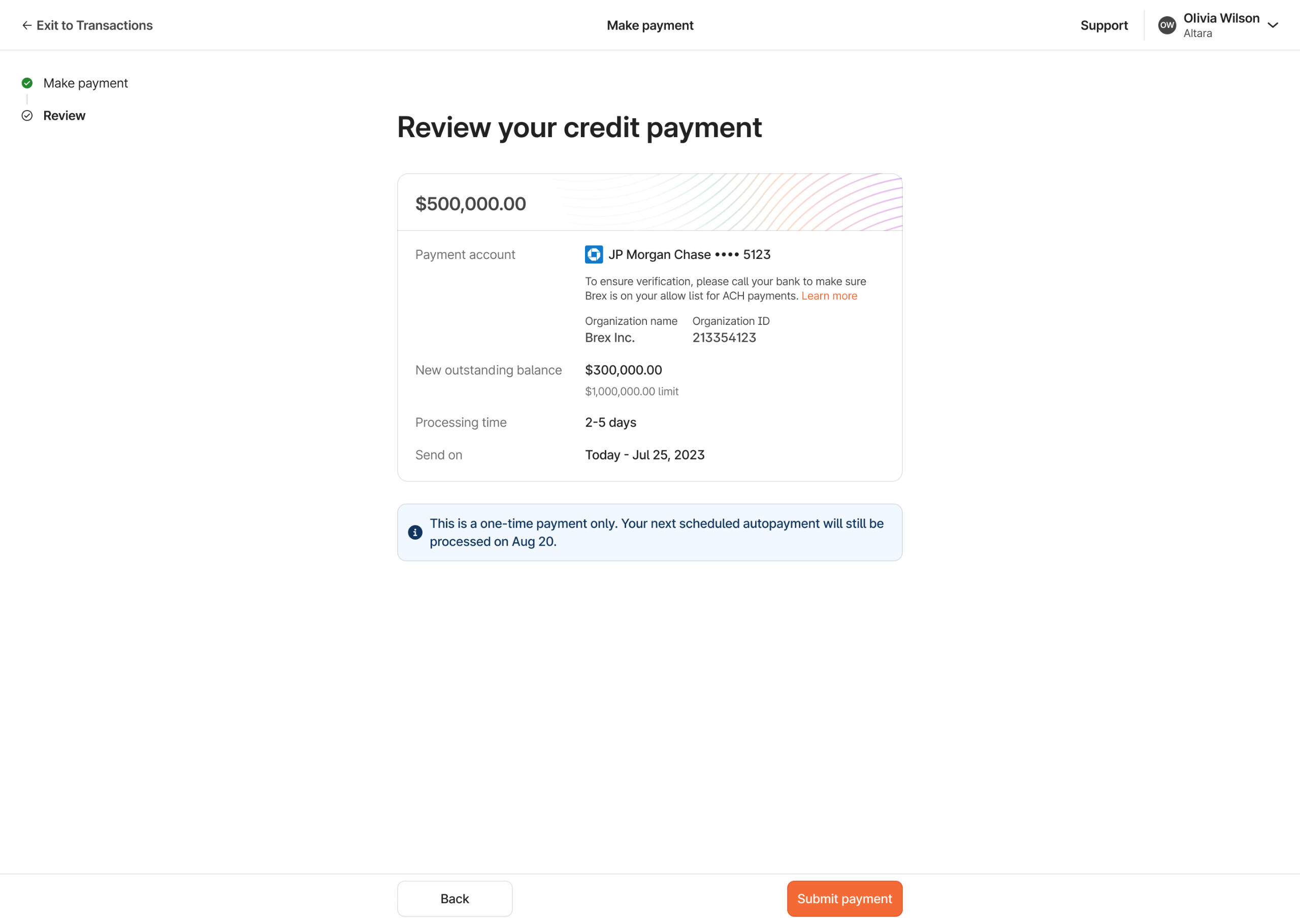 I worked with my group's Product partner to determine if changes to the customer credit limit experience that I oversaw could contribute to the OKR. We realized that our underdeveloped early payments feature (which had been largely untouched since launching in Q4 2022) could be a useful tool to prevent customer credit limit drops.Enabling the feature let customers configure a trigger for automatic one-time payments once they crossed a preset utilization amount — e.g. a customer's balance was paid in full from a preselected bank account when a customer passed 75% of their credit limit.