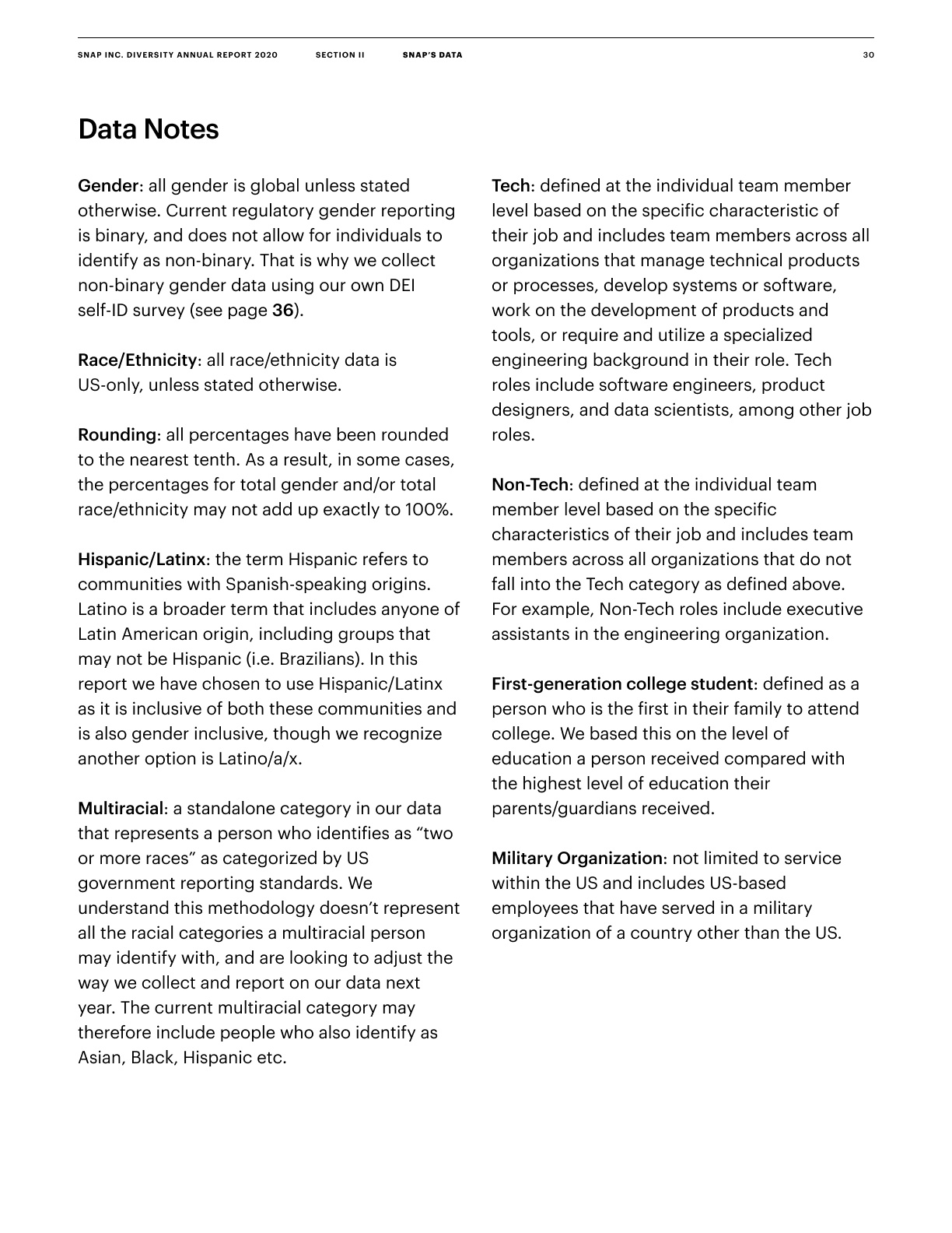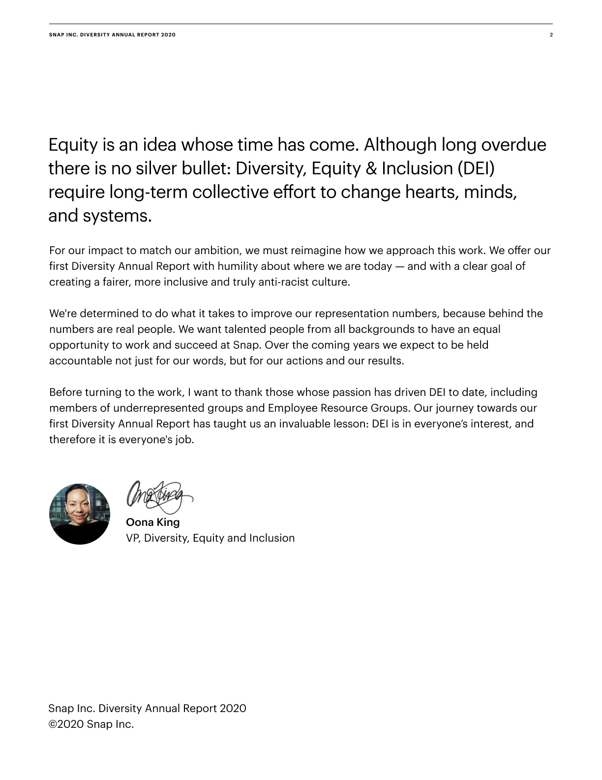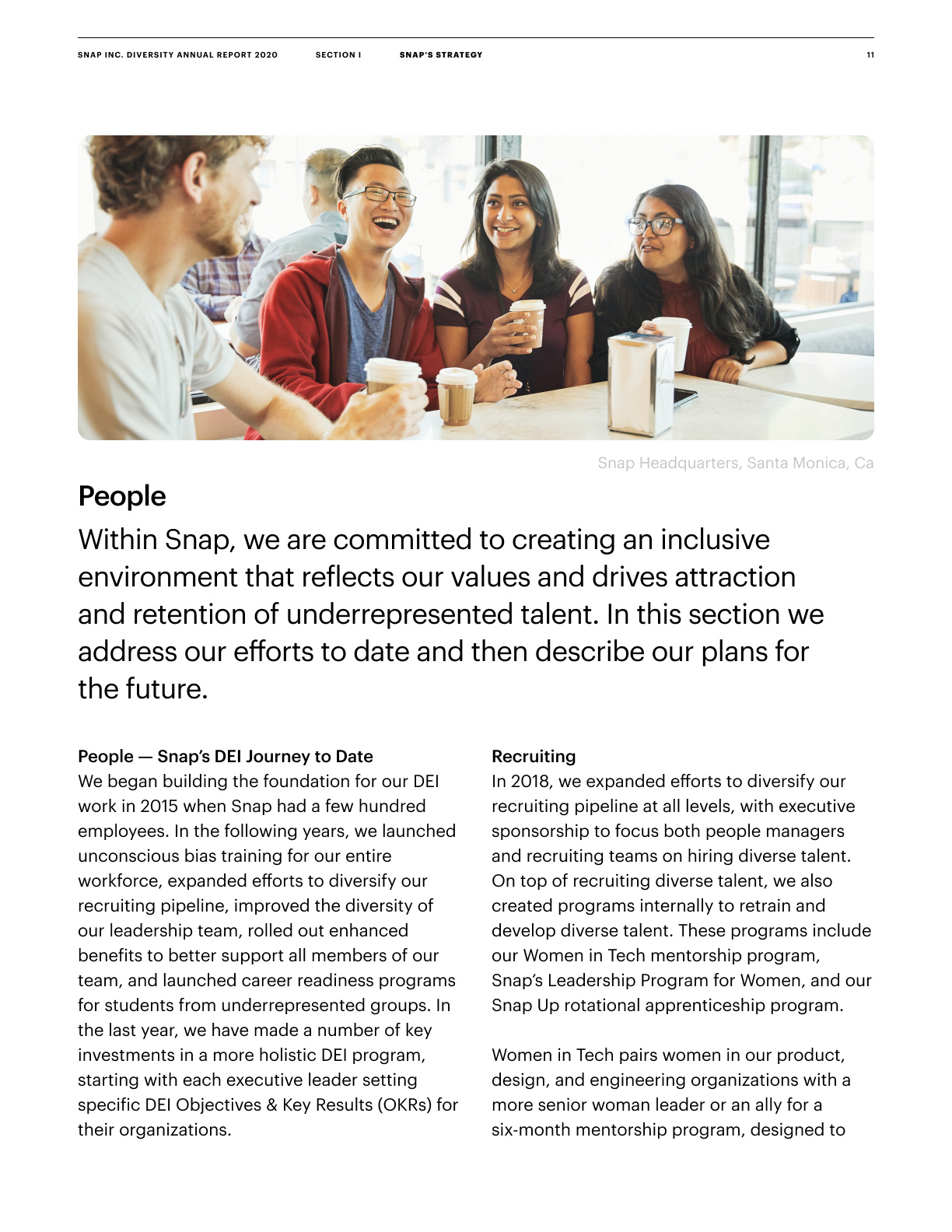 Outcome: 2019 and 2020 reports published to Snap's Diversity site, with many template elements still in use through their 2024 report.