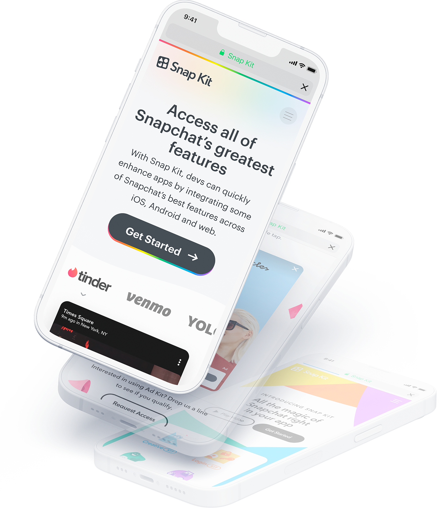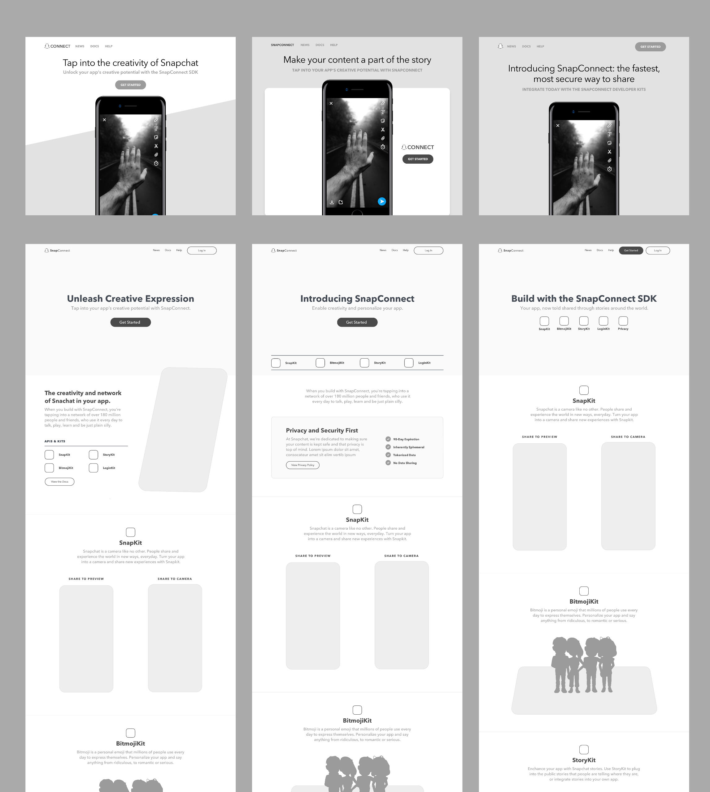 Although developers would be the core audience for the site, we urged the Snap Kit team to also consider non-technical decision makers as their audience.Since anyone visiting the site might not be so familiar with the nuances of Snapchat, we made sure we fully understood the core mobile product and the ins-and-outs of the possibilities of Snap Kit.We proposed inserting single-serving app examples (color coded of course) on the site so visitors could quickly see the benefits of each kit. We designed multiple app concepts and worked with a motion designer to animate each one.