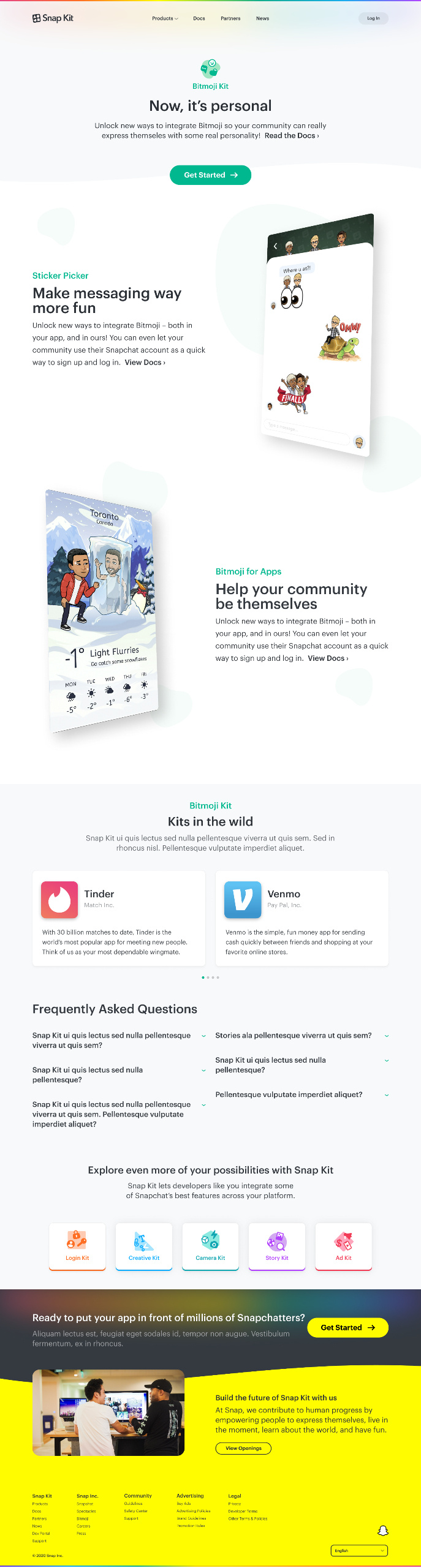 With multiple successful releases with the Snap Kit team, the Snap for Business team reached out for another web design project.The company had been struggling with siloed-off teams building too many variants of web design visual languages. We agreed with the Snap creative director's request and set one core principle of this project was to attempt to create a baseline for a visual design language that the other web properties could move towards, unified under a "Snap Inc." banner.We designed the advertising site and handed off the materials for the Snapchat web developer team to implement.