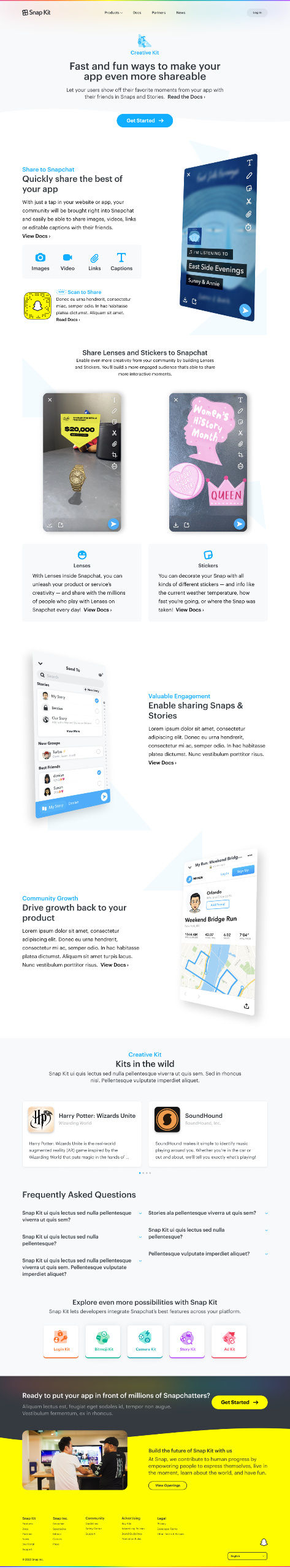 I wrote most of the content on the site as directional placeholders, but after review by Snap's content and legal teams, most of it stayed in place (I was just happy that my favorite line for Story Kit stayed in: "We built stories so you don't have to.") 🎉